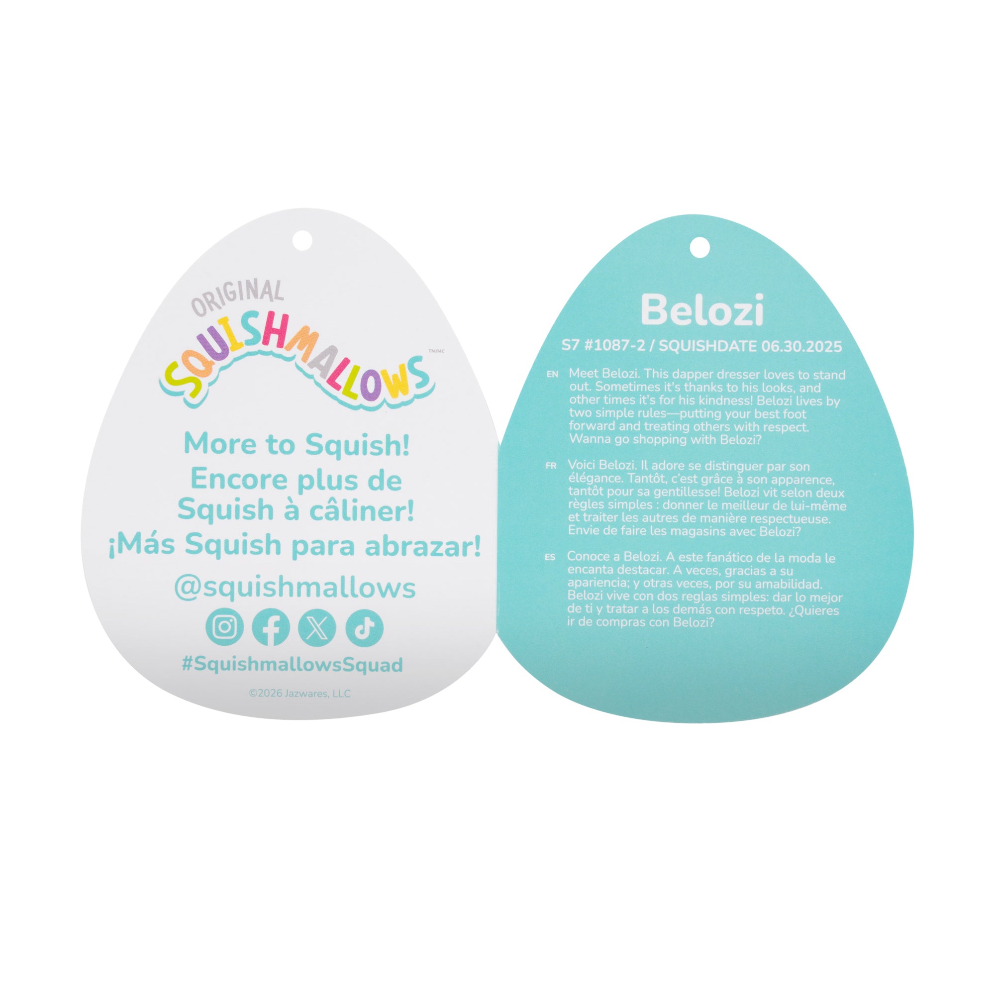 6.30.2025Meet your new bestie, Belozi! Each Squishmallow plush comes with its own unique name and bio and makes the perfect cuddly companion for long flights out or comfy nights in. Belozi is only by Original Squishmallows. Join the Squad today!