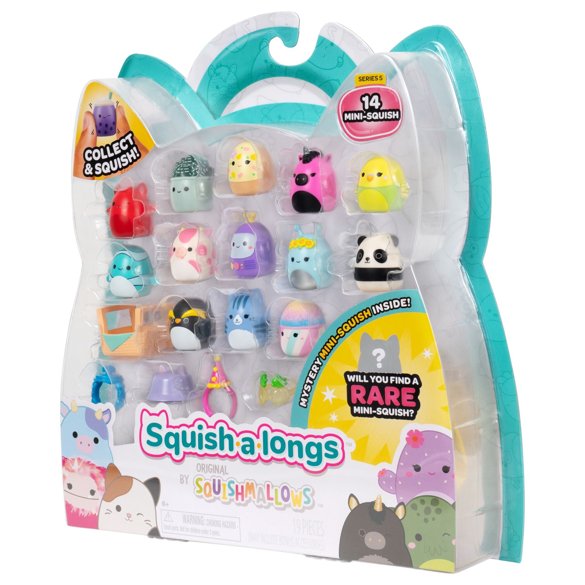 Squish on the go with Squish-a-longs! These portable collectibles are made of squeezable plastic and feature your favorite Squishmallows in their smallest size yet. With plenty of ways to Squish—in addition to 140+ Mini-Squish in Wave 3 alone—the Squish might be small but the possibilities are endless. This Squish-a-longs 14-pack includes a Mini-Squish ring attachment for on-the-go Squish styling in addition to Glasses, Snowboard, Red Beanie, and Cookie Bowl accessories for Mini-Squish modeling. Feeling lucky? You might just come across Neely the Neapolitan Ice Cream Sandwich or Dilka the Lavender Bigfoot, two chase Mini-Squish that are as adorable as they are rare! Collect them all with help from the numbered Squish-a-longs Collector’s Guide and join the Squad today!