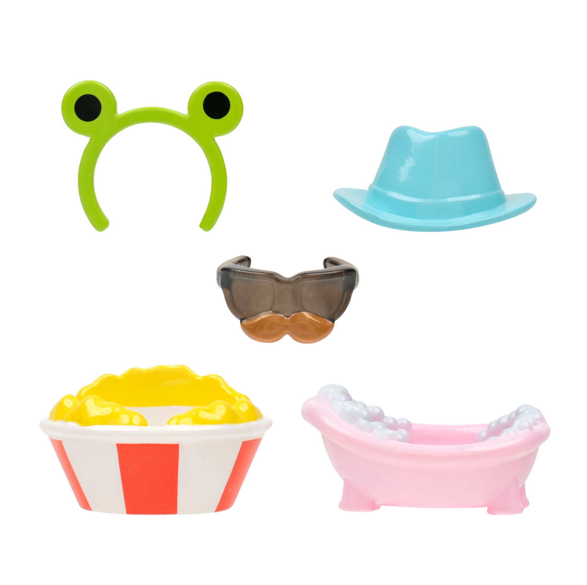 - ACCESSORIES: Accessorize your Mini-Squish with the included Frog Headband, Funny Glasses, Blue Cowboy Hat, Popcorn, and Bubble Bath accessories, or attach your Mini-Squish to the Squish-a-longs ring for on-the-go fun!