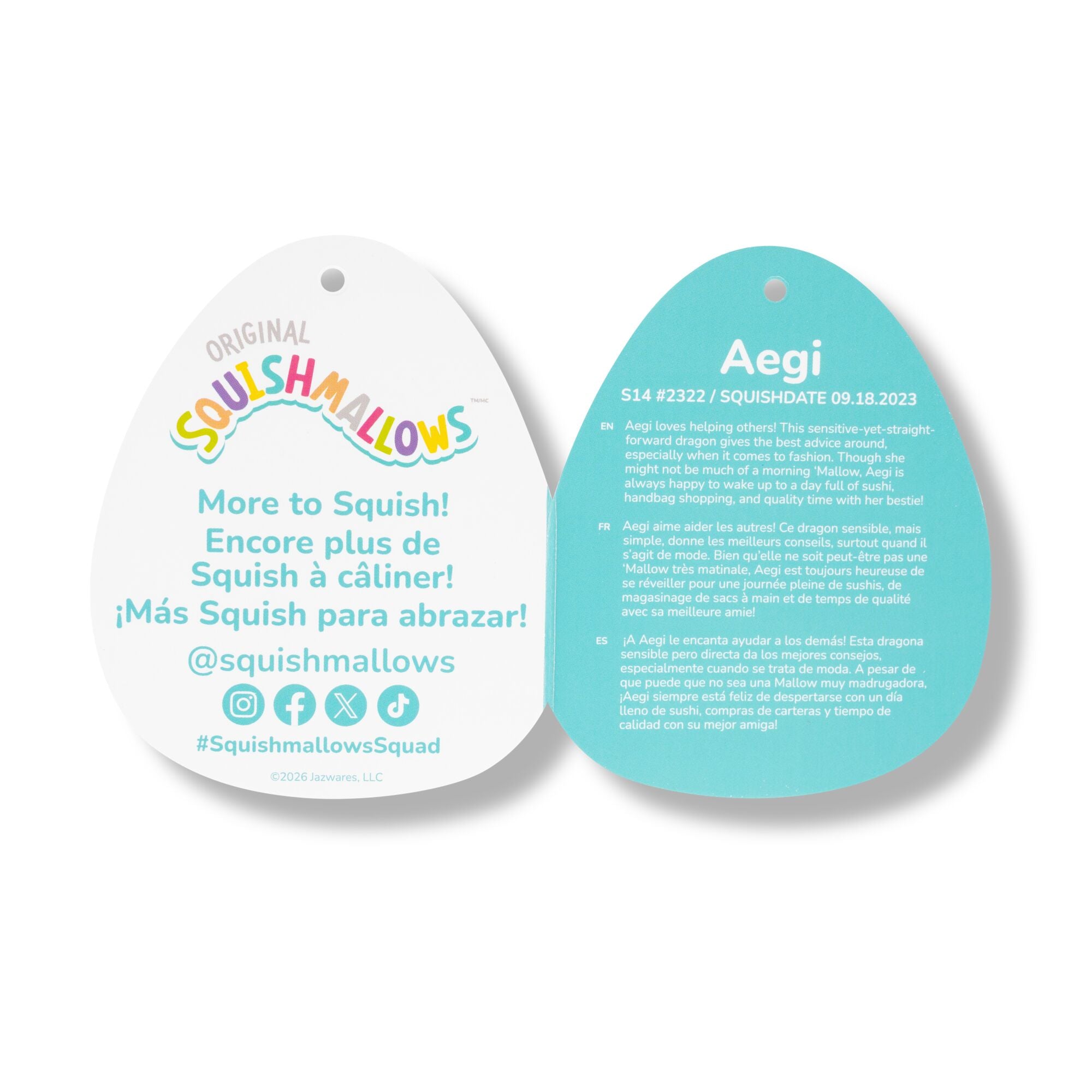 9.18.2023Meet your new bestie, Aegi! Each Squishmallow plush comes with its own unique name and bio and makes the perfect cuddly companion for long flights out or comfy nights in. Aegi is only by Original Squishmallows. Join the Squad today!