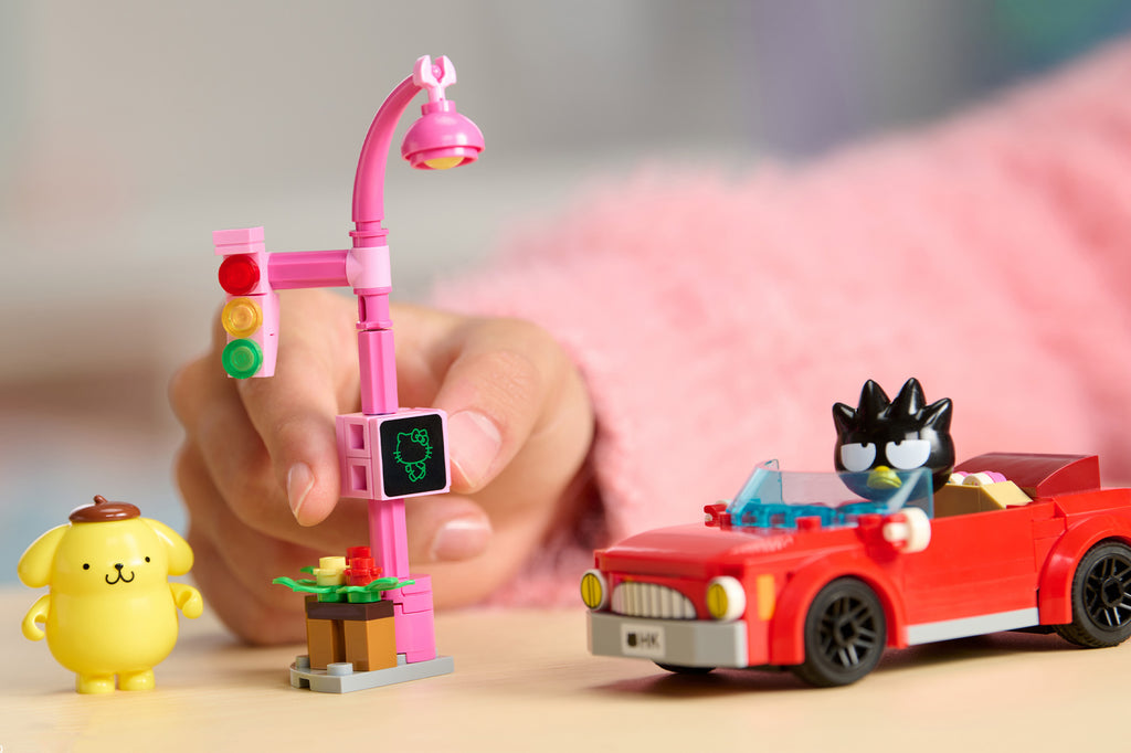 - MINIFIGURES: Badtz-maru and Pompompurin, the adorable poseable minifigures, are ready for an exciting adventure as they take turns behind the wheel of their stylish convertible, zooming through town while keeping an eye on traffic signals.