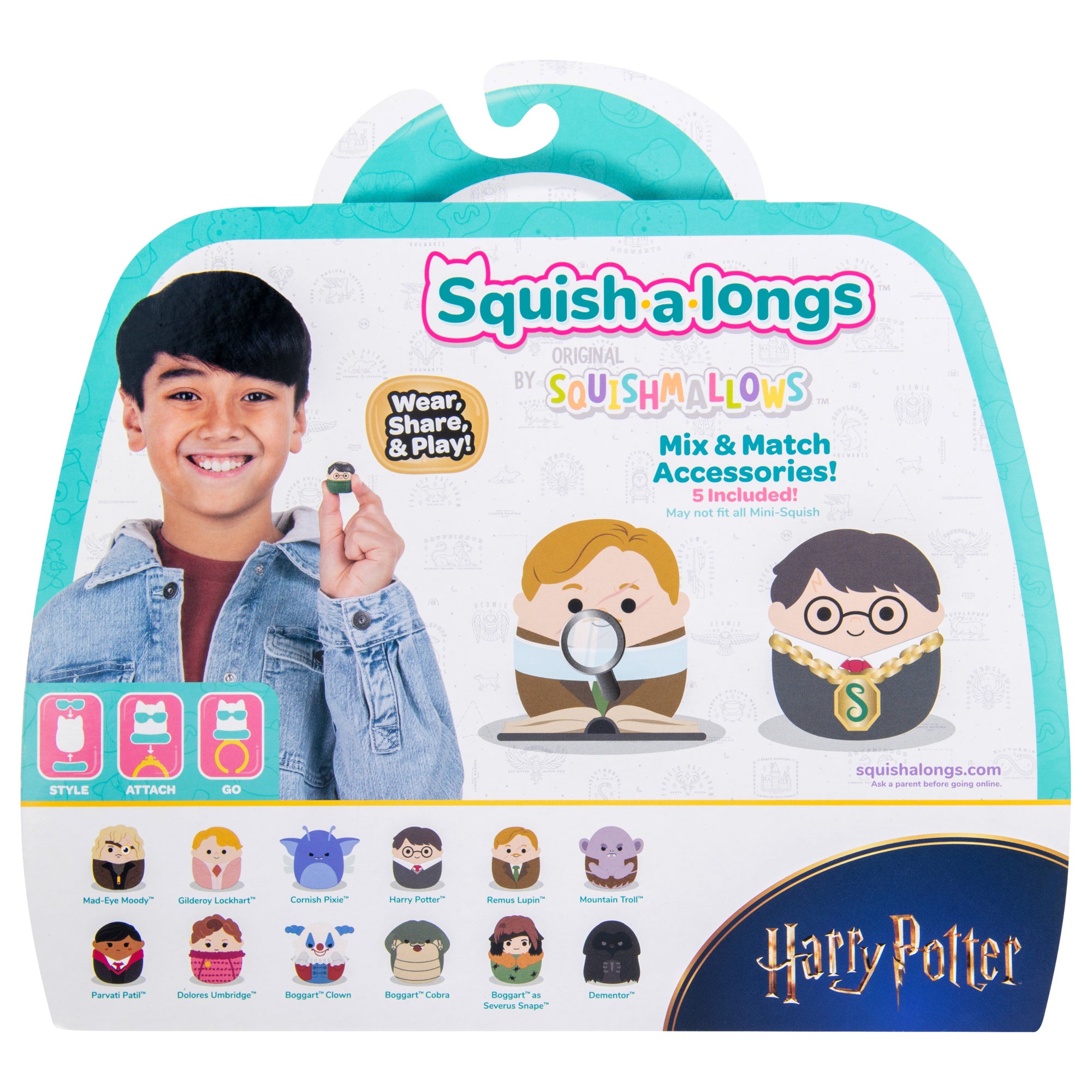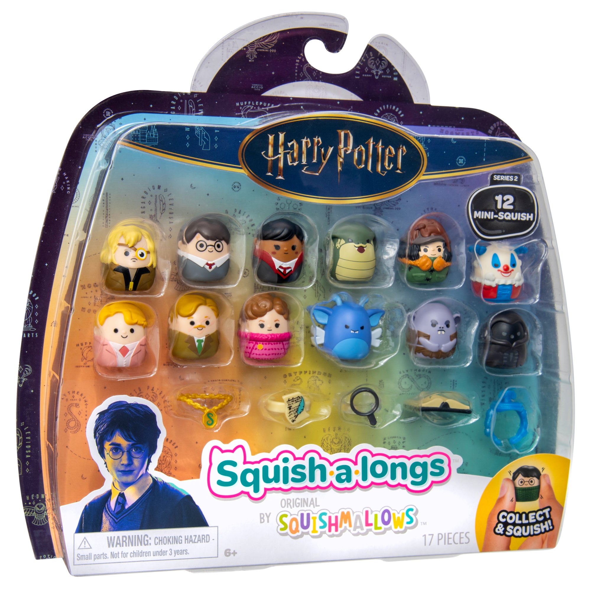 Bewitch your Squad with “Harry Potter” Squish-a-longs! This Squish-a-longs multipack includes 12 “Harry Potter” Mini-Squish—Mad-Eye Moody, Gilderoy Lockhart, Cornish Pixie, Harry Potter, Remus Lupin, Mountain Troll, Parvati Patil, Dolores Umbridge, Boggart Clown, Boggart Cobra, Boggart as Severus Snape, and Dementor—in addition to Slytherin's Locket, Quill & Parchment, Magnifying Glass, and Dark Arts Book Sit-In accessories for Mini-Squish styling. Play or display your “Harry Potter” Squish-a-longs at home, or attach your Mini-Squish to the included ring accessory to take the magic on the go! Only by Original Squishmallows and officially licensed by Warner Bros. Discovery. Join the Squad today! -