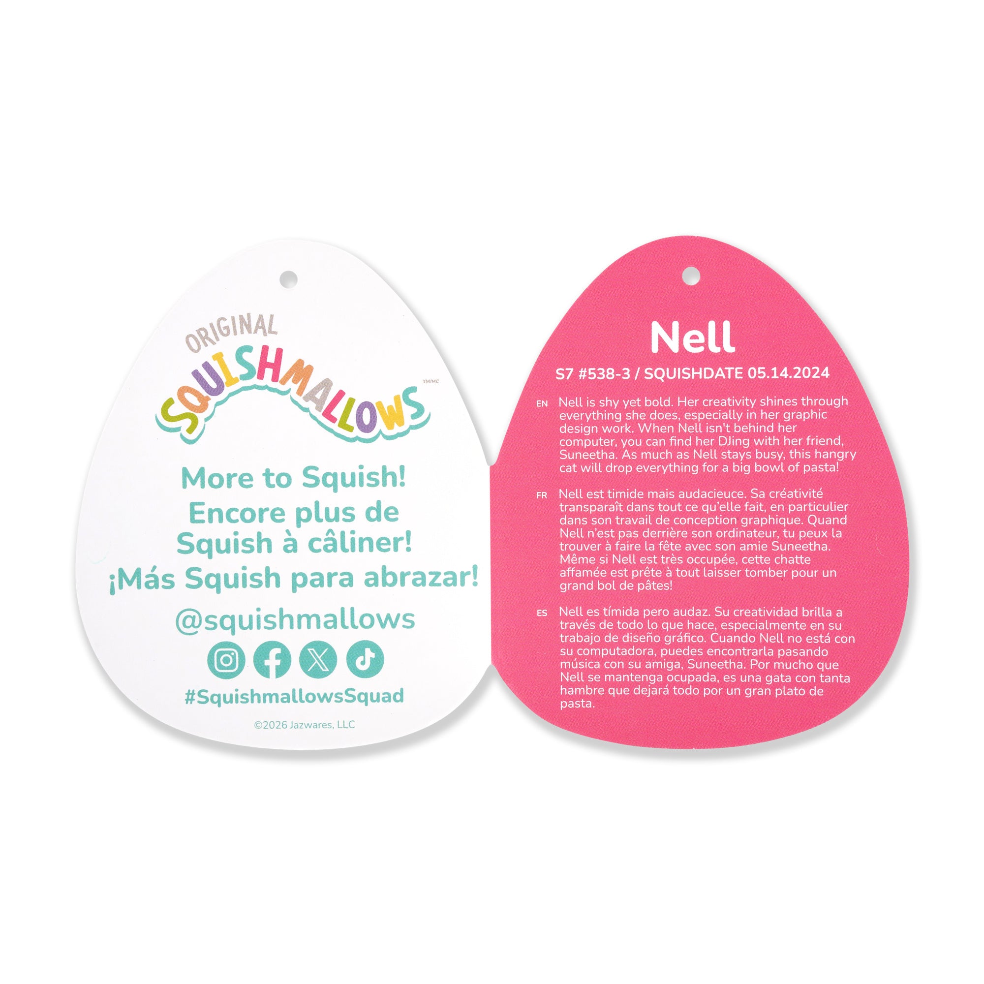 5.14.2024Meet your new bestie, Nell! Each Squishmallow plush comes with its own unique name and bio and makes the perfect cuddly companion for long flights out or comfy nights in. Nell is only by Original Squishmallows. Join the Squad today!