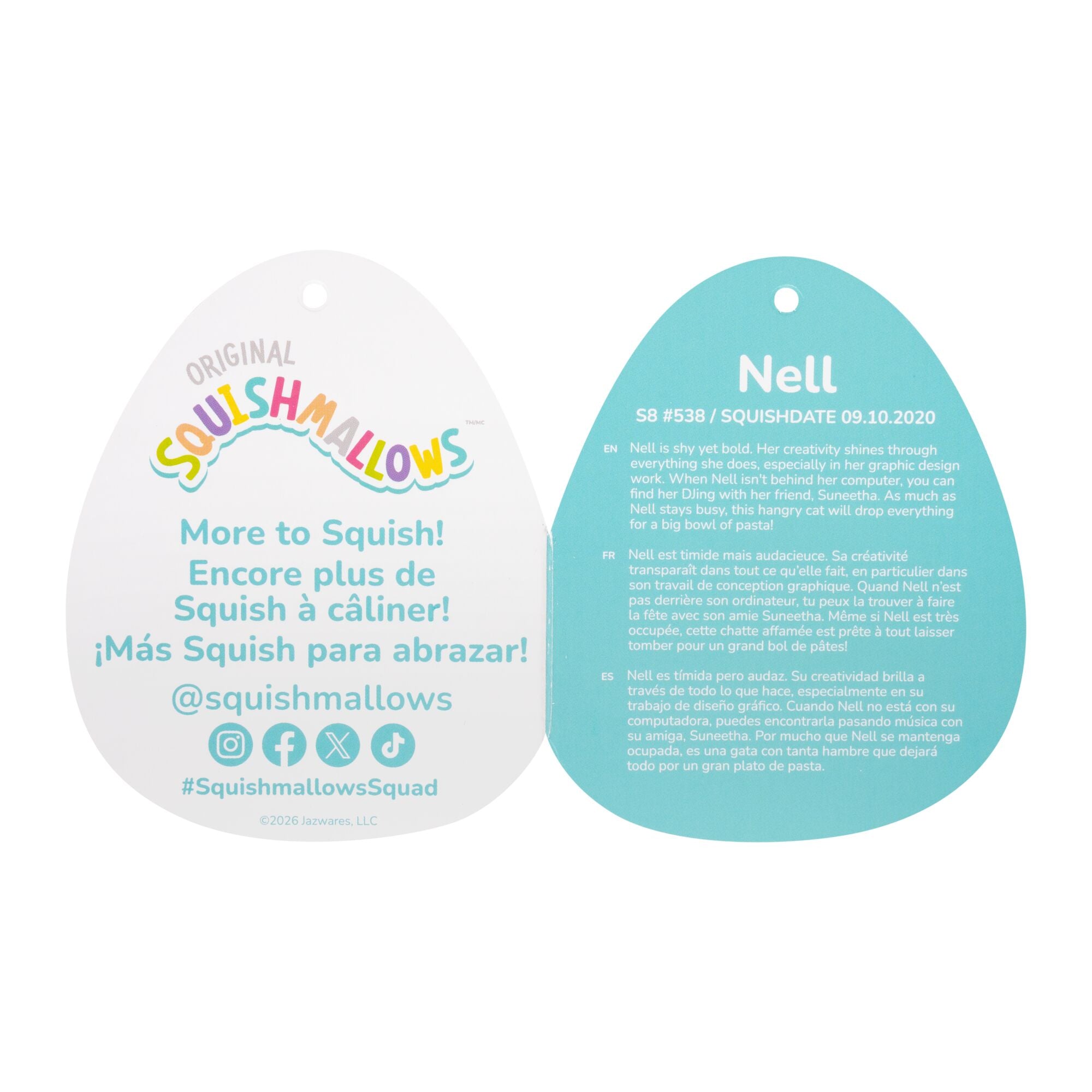 Meet your new bestie, Nell! Each Squishmallow plush comes with its own unique name and bio and makes the perfect cuddly companion for long flights out or comfy nights in. Nell is only by Original Squishmallows. Join the Squad today!