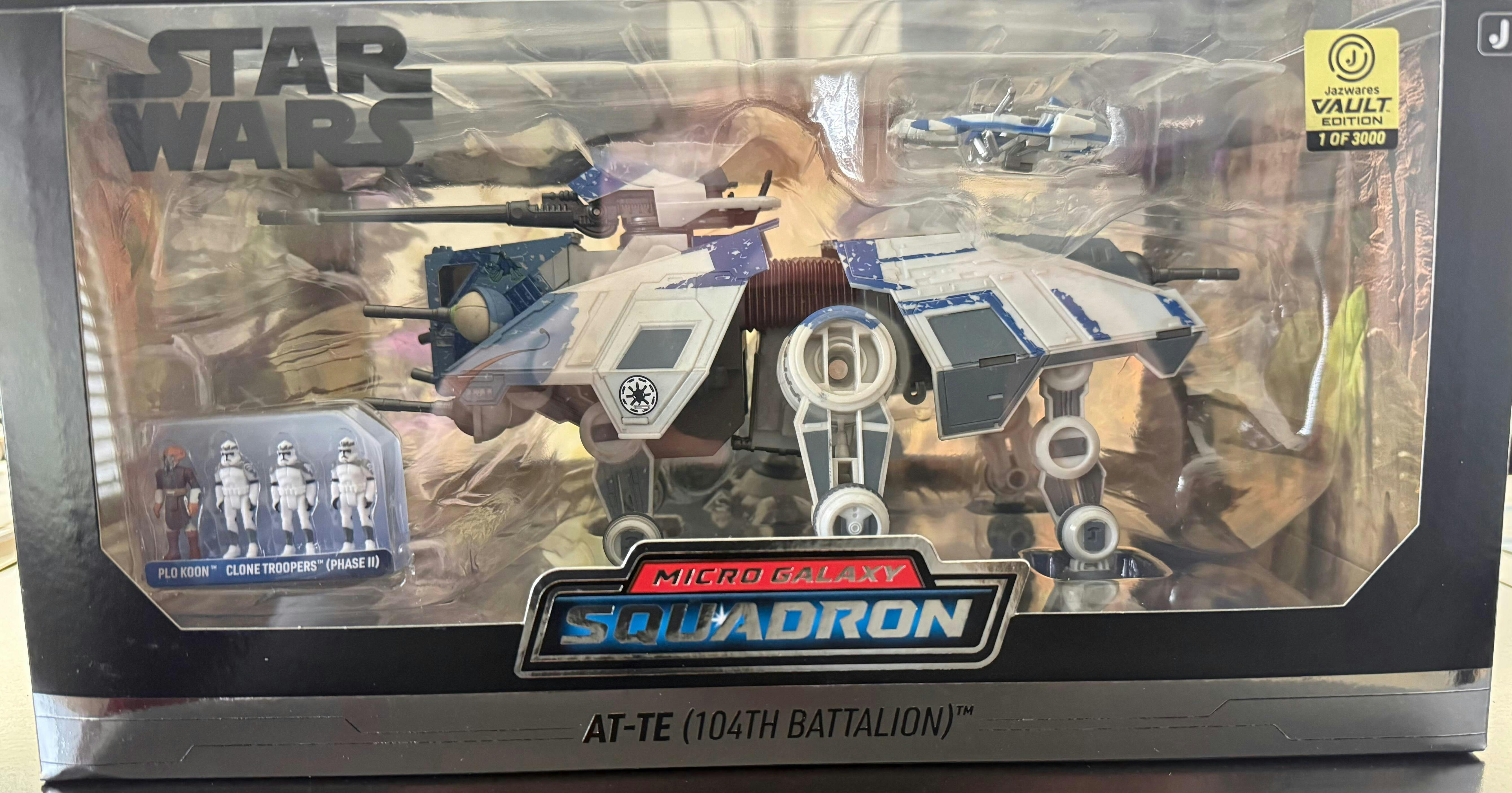 Run with the wolves in the Star Wars Micro Galaxy Squadron AT-TE (104th Battalion)! This brand new edition of the 9-inch vehicle returns with the iconic battle emblem of the storied Wolf Pack. It also comes with a BARC Speeder with 104th colors, four micro figure accessories including Plo Koon, and collectible packaging.